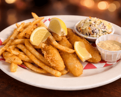 Wild-caught alaskan cod dipped in a white ale batter and fried to a golden brown, with fries, coleslaw, lemon wedges and our in-house tartar sauce