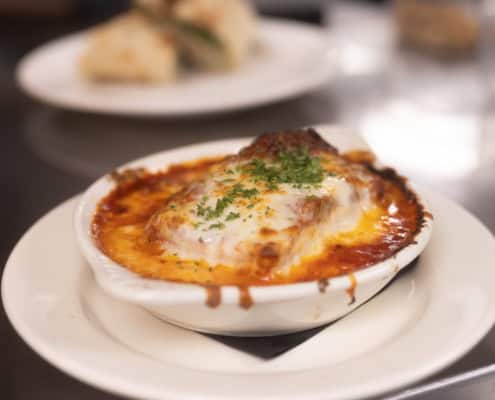 Our in-house 3-layer lasagna stuffed with beef, sausage, ricotta, feta, parmesan, romano, and mozzarella cheese mix, and our house marinara